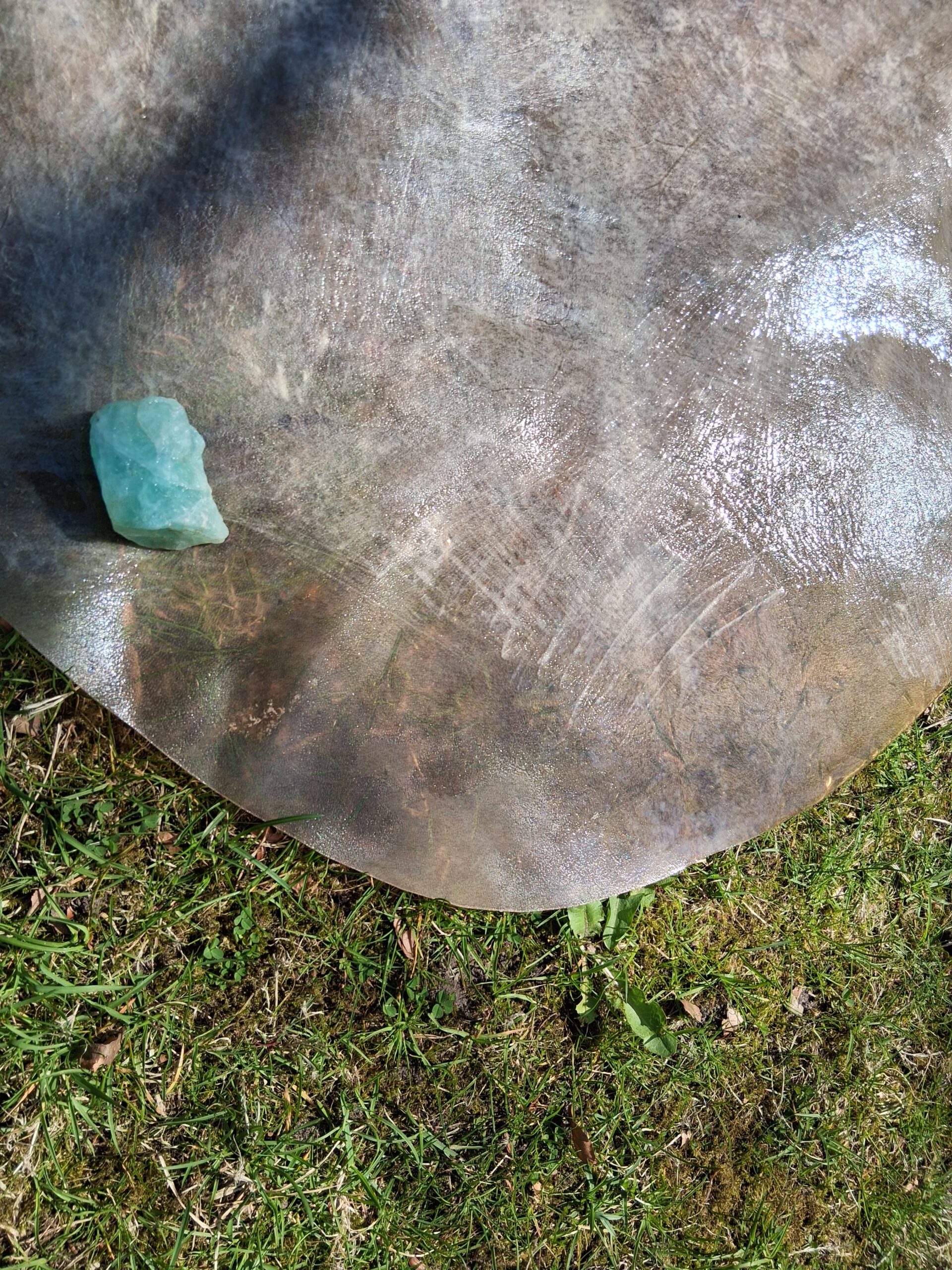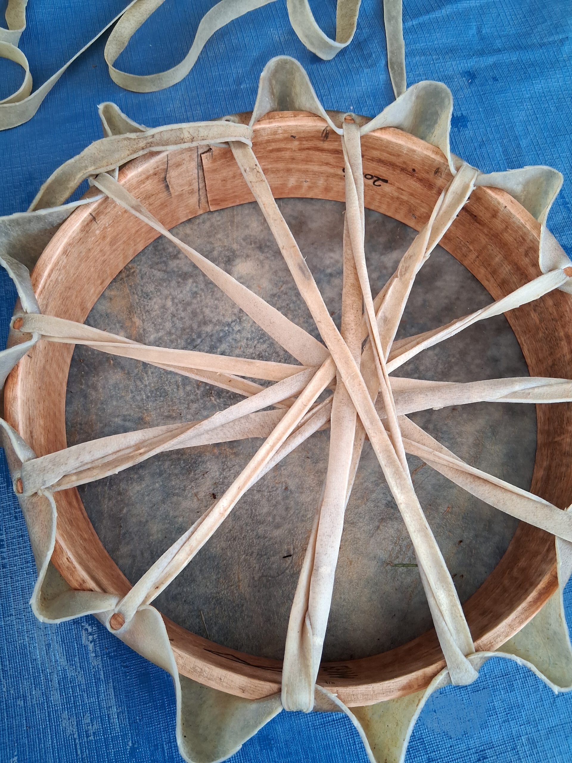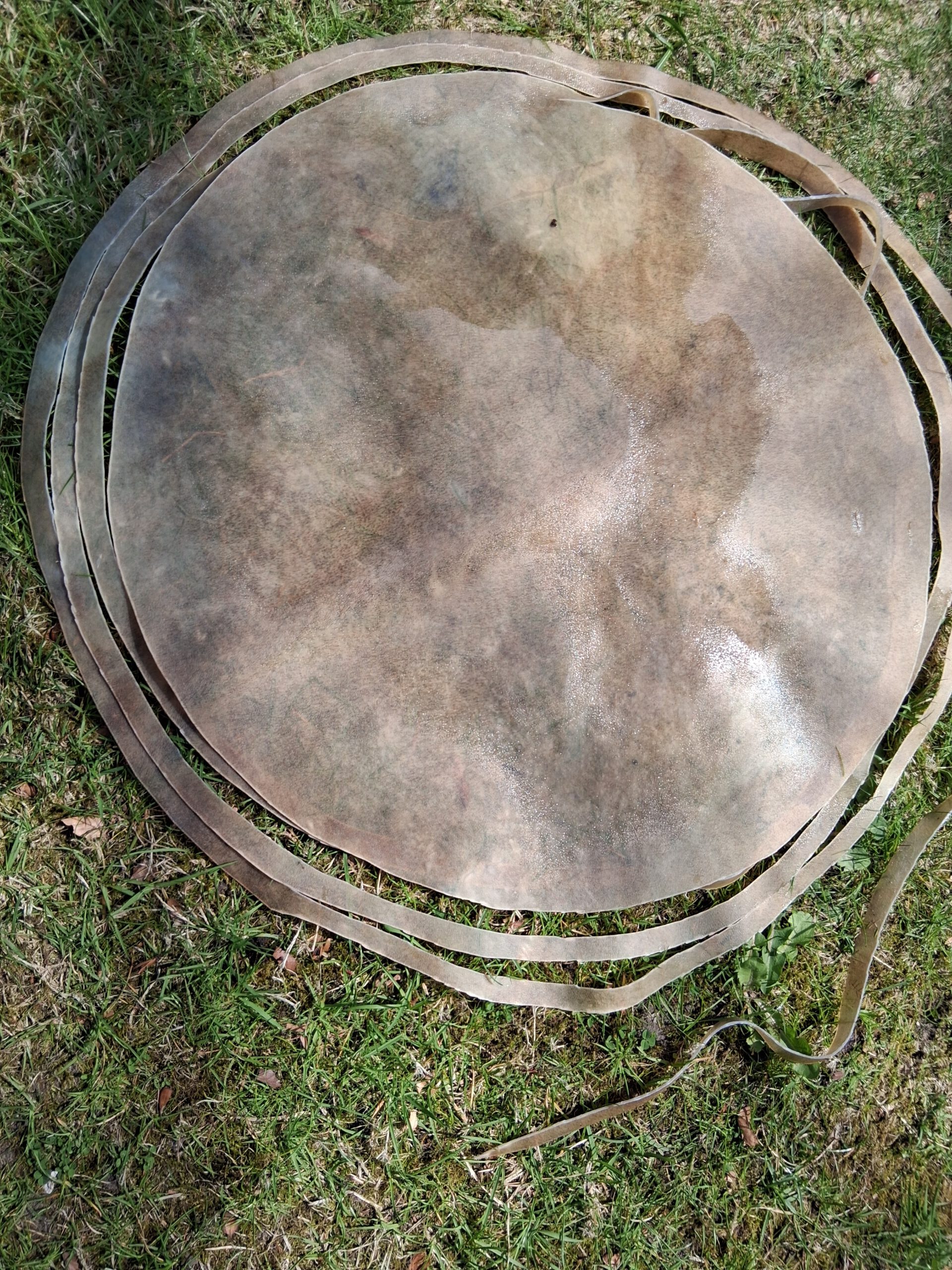 Erst muss die Haut eingeweicht werden, dann muss die Rückseite mit einem Stein aufgerauht werden. Da ich keine Schnüre hatte und die Haut groß genug war, habe ich eine Schnur geschnitten (natürlich viel zu lang). Löcher in den Rand stanzen, die Schnur spannen und dann das Griffkreuz knoten. Eigentlich ist sie mir zu schrill – ich habe sie
