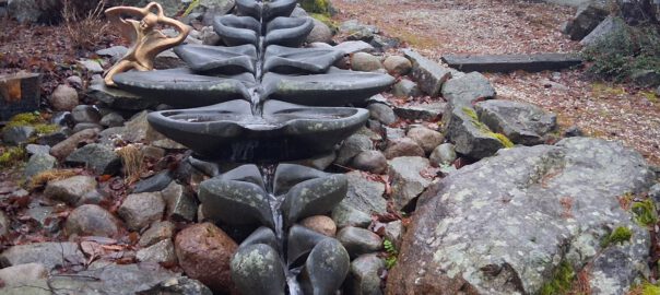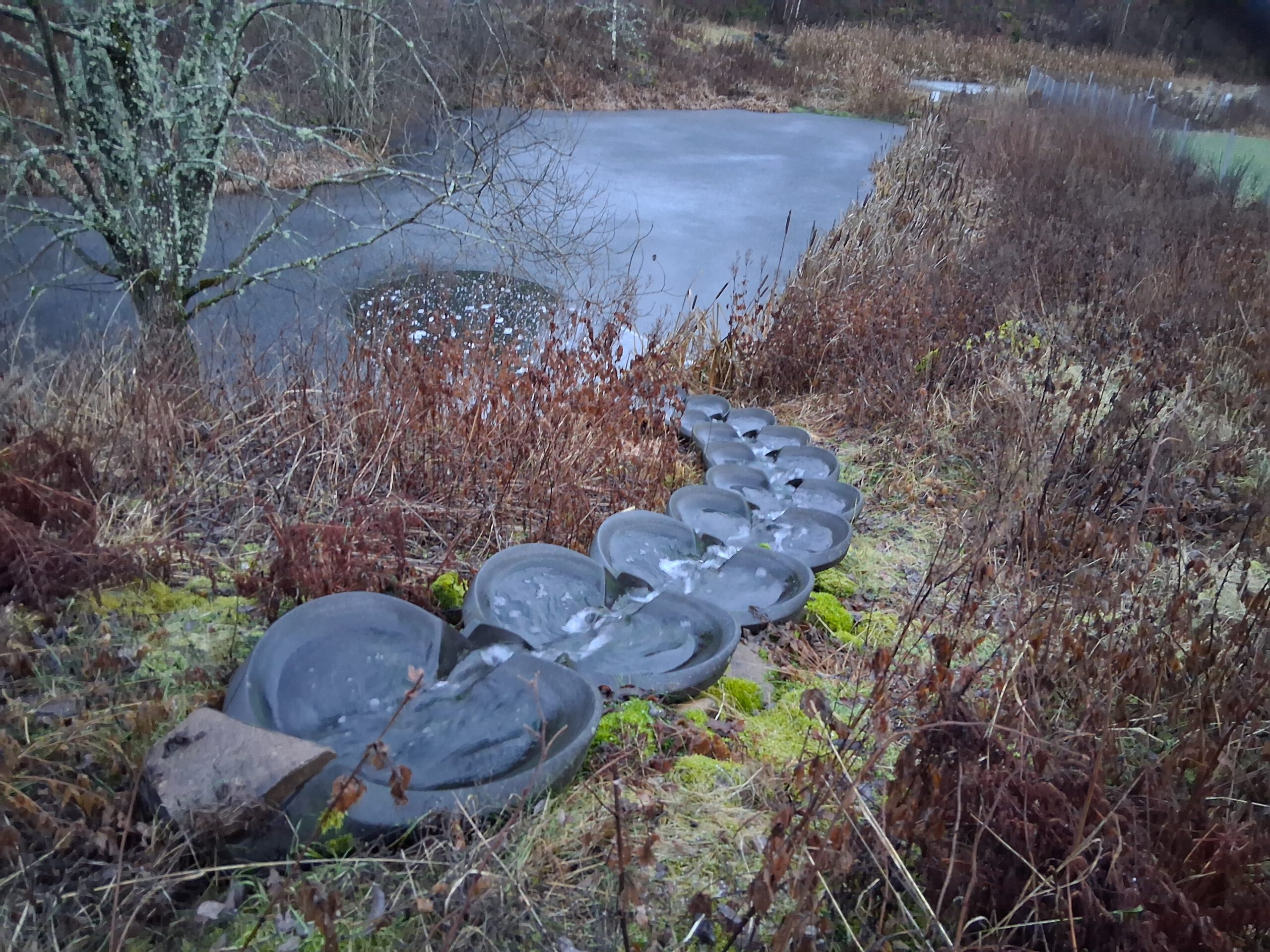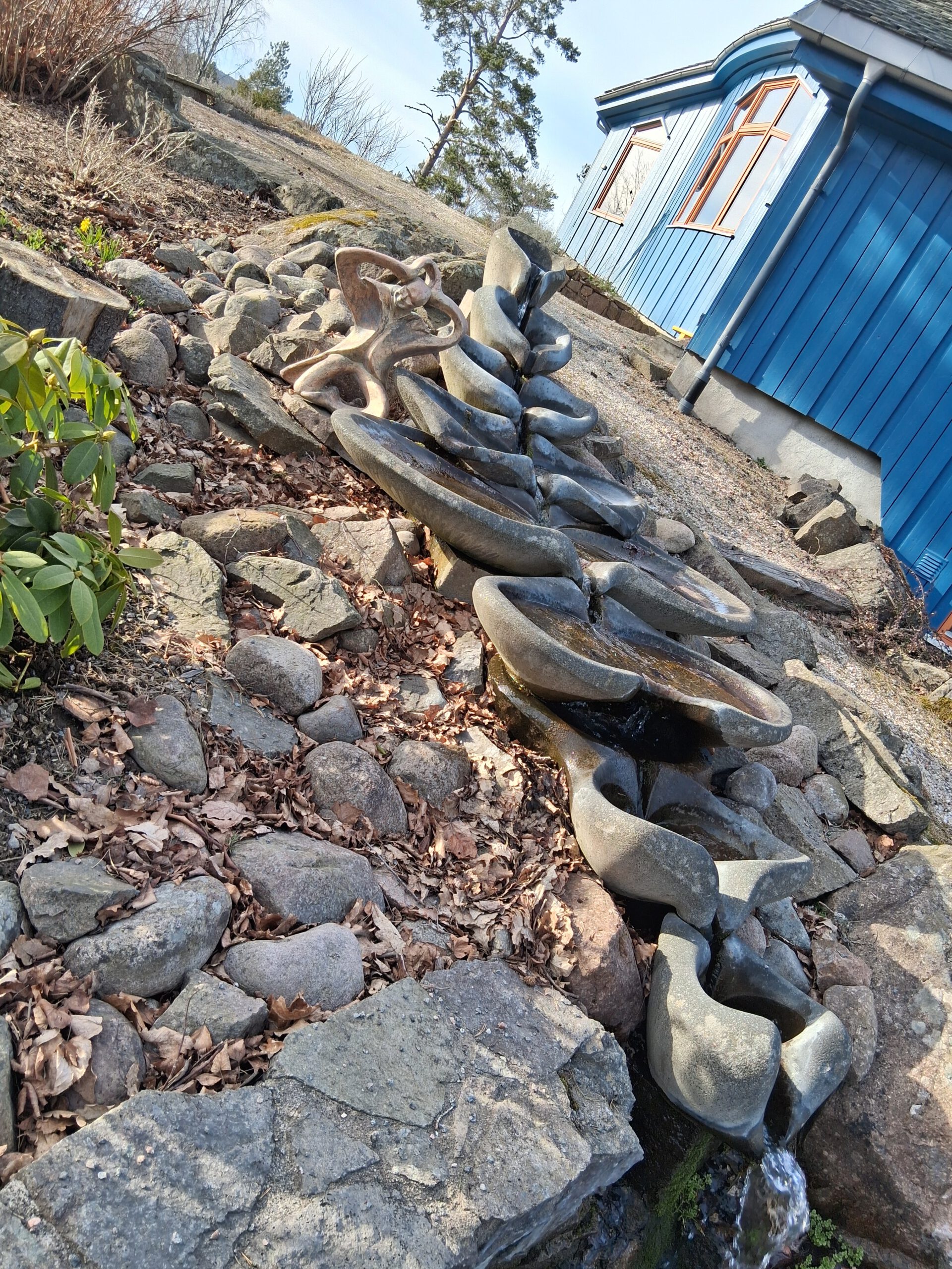 So gibt es interessante Wasseranlagen. Das Wasser wird durch eine Pumpe auf eine kleine Anhöhe gepumpt und dann darf es über verschiedene Becken aus Beton laufen. Es gibt hier in Vidaråsen mindestens 4 solcher Beckenläufe. Davon 2 im Dorf, die anderen beiden sind an die Ökokläranlage angeschlossen. (Hier im Dorf wird nur mit Sonett oder Ecover gewaschen, gespült, geputzt etc. Ausnahme ist die Schmierseife, das ist wohl ein norwegisches Produkt.) Das Wasser läuft von oben in das nächste Becken und läuft erst auf die eine Seite, dann auf die andere und dann erst in die nächste Schale. Es läuft einmal eine 8 und in der nächsten ebenfalls. Gerade von oben betrachtet sieht das sehr schön aus. In breiten, flachen Schalen hat das Wasser mehr Zeit und einen längeren Weg, in kleinen, tiefen Becken, geht es schneller. Dieses Prinzip geht möglicherweise auf Schauberger zurück. Allerdings weiß ich es nicht genau.