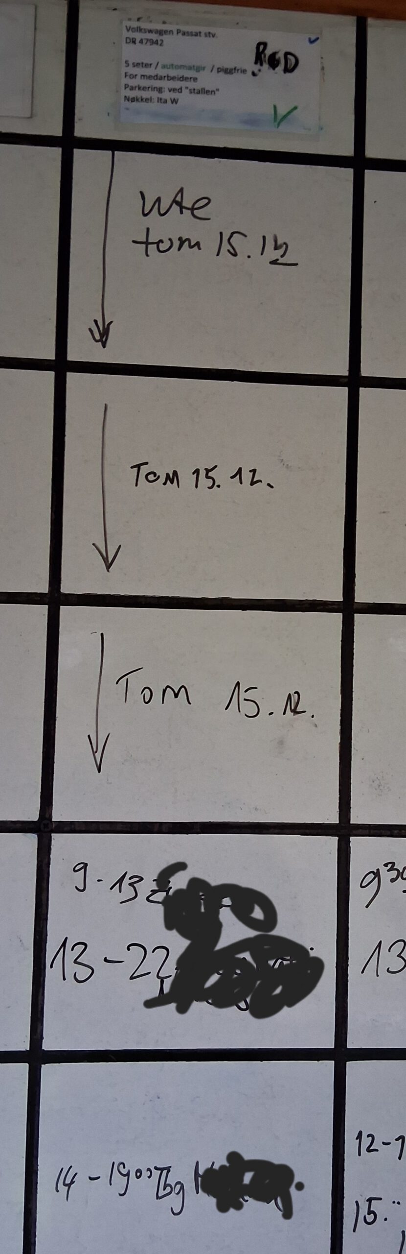 An einem Gebäude ist eine große weiße Tafel, an der jeder Wochentag und jedes Auto aufgezeichnet ist. Auch, ob es ein E-Auto oder ein Diesel ist, ob es Automatik- oder Schaltgetriebe hat. Piggdecks (Winterreifen mit Spikes) hat oder piggfri ist. Ein Auto ist für Dienstfahrten reserviert. Zwei Autos für die Praktikanten. Alle anderen Autos darf man nutzen, wenn sie frei sind. Längere Fahrten, wie z.B. meine Urlaubsfahrt habe ich vorher geklärt und erst anschließend die Fähre gebucht. Passat rød ist ein Automatik, mit dem ich schon in Drammen war: fährt sich gut.