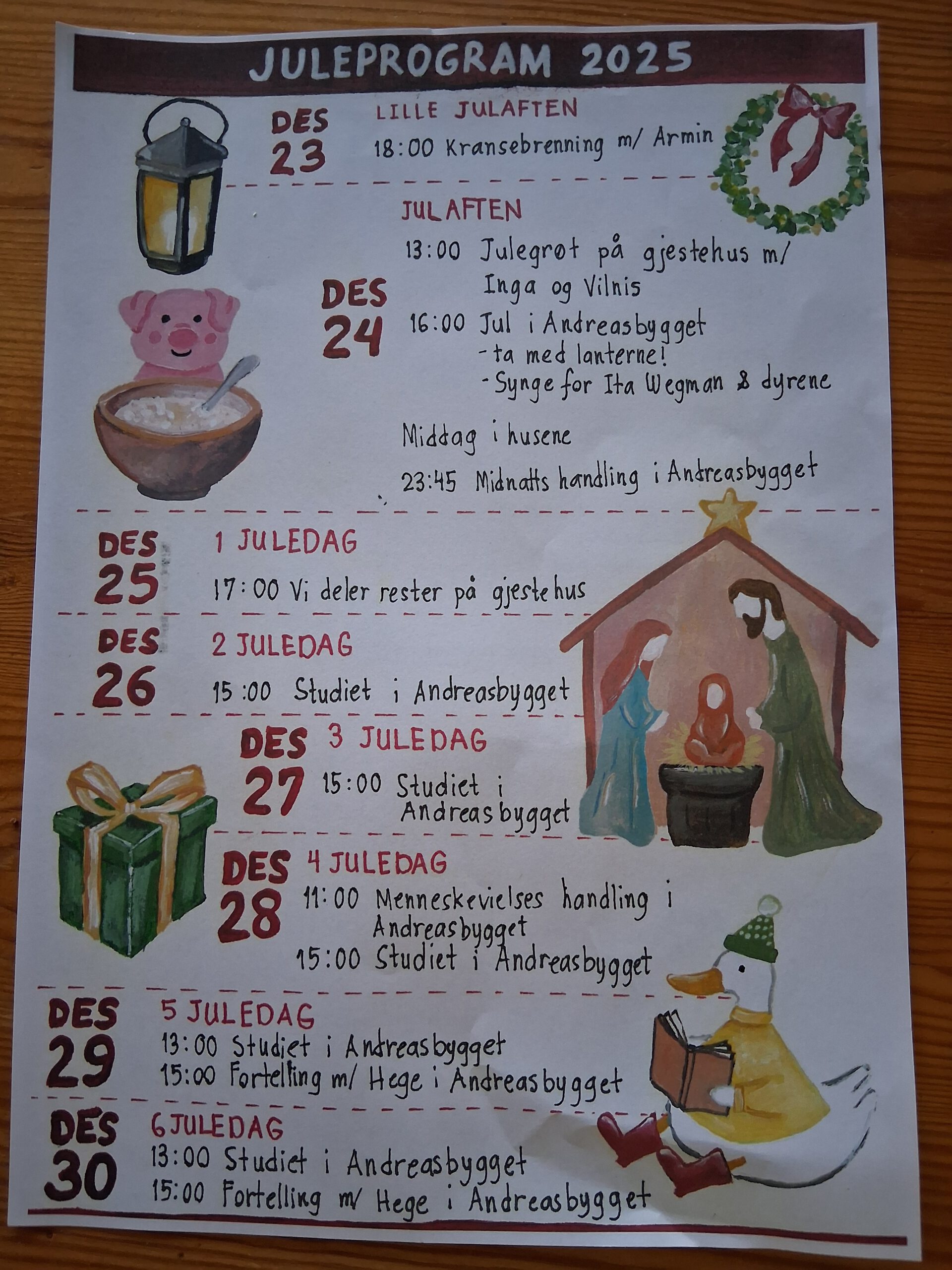 Das Juleprogramm ist heute mit der Post gekommen. Hier wird sehr schön deutlich, dass es sich in Norwegen (oder in ganz Skandinavien?) um den Julerommet – den Juleraum handelt. Weihnachten dauert hier länger, obwohl es hier auch nur 2 Weihnachtsfeiertage gibt. Es geht alles etwas beschaulicher zu.
